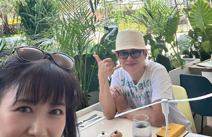 薬丸さんは親指と小指を立てたアロハのポーズをし、向かいに座った妻は頭にサングラスを乗せて笑顔でカメラを見つめていて、2人はリラックスした雰囲気に包まれています。