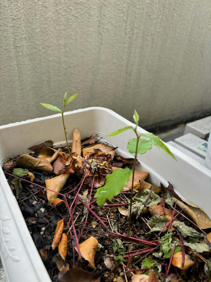 今回の投稿で村上さんは、「昨年の秋にゴルフ場で拾って来た栗 土の中から顔出してくれました」と報告し、自宅にあるベランダの様子を公開しています。