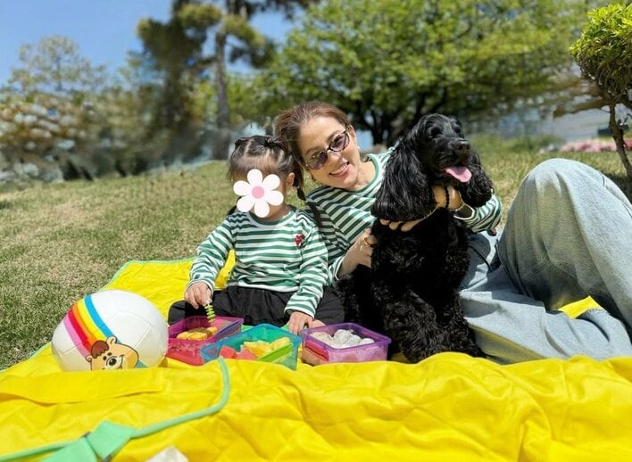 公開された写真には、緑豊かな公園のような場所でビビットなイエローのレジャーシートの上に座る永島さんと、2歳の娘さん、そして3歳の愛犬が仲良く寄り添う姿がおさめられています。