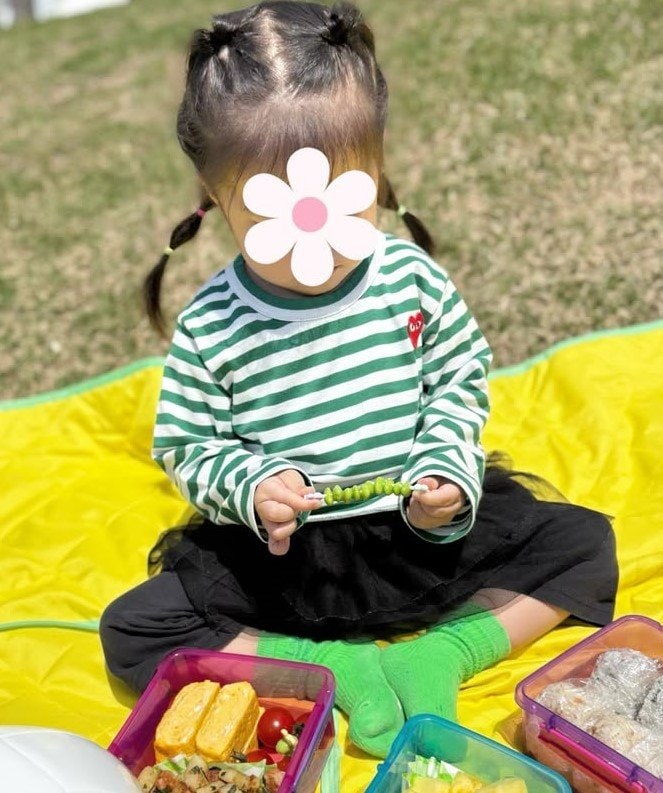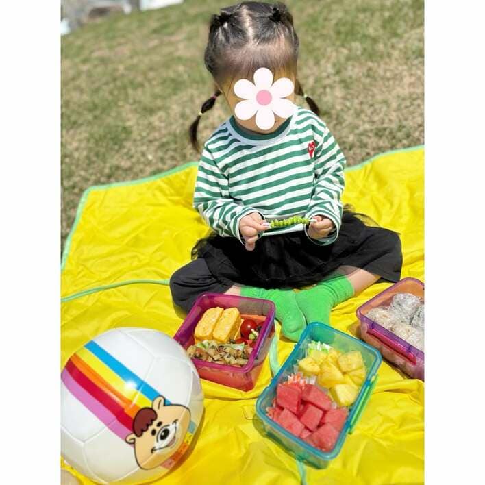 また、ピンクやブルーの透け感のあるお弁当箱とイエローのレジャーシートが相まって、思わず写真を撮りたくなる色合いです。