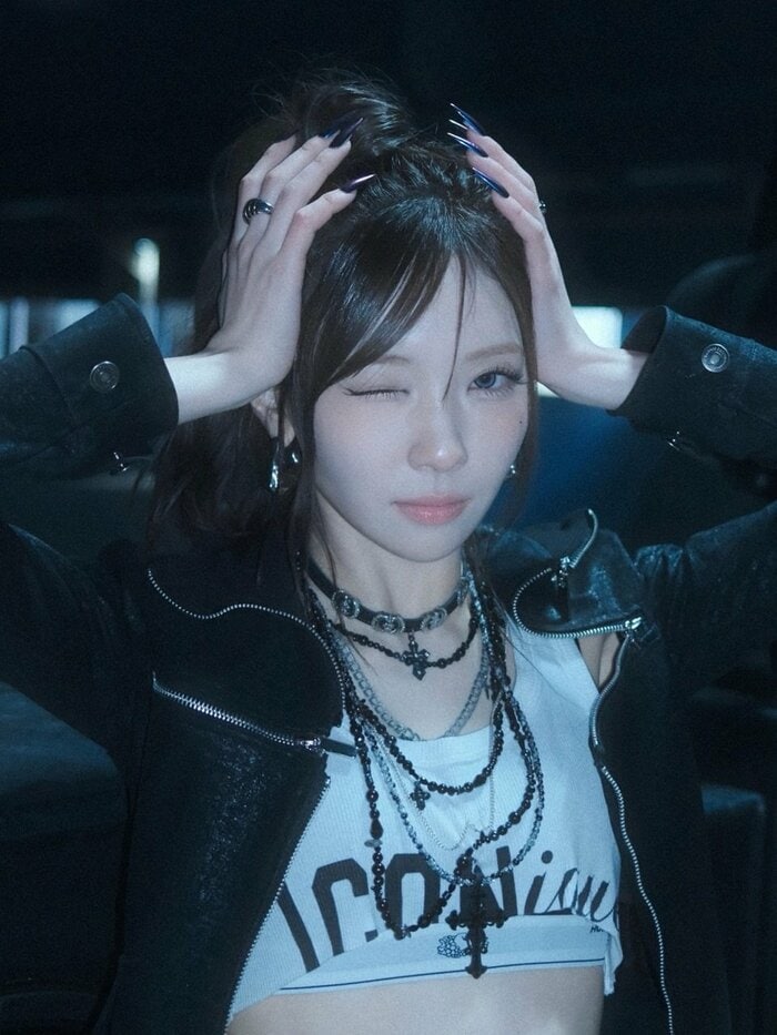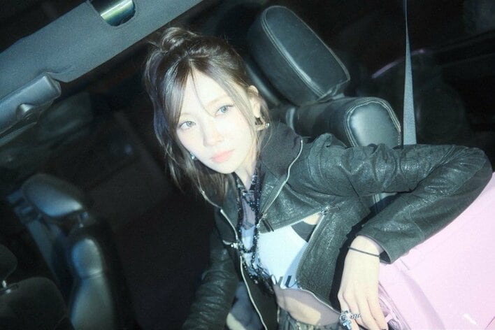 淡いピンクの車に乗り、窓枠に軽く腕をかけたショットは、大きな瞳や透明感あふれる肌が印象的です。