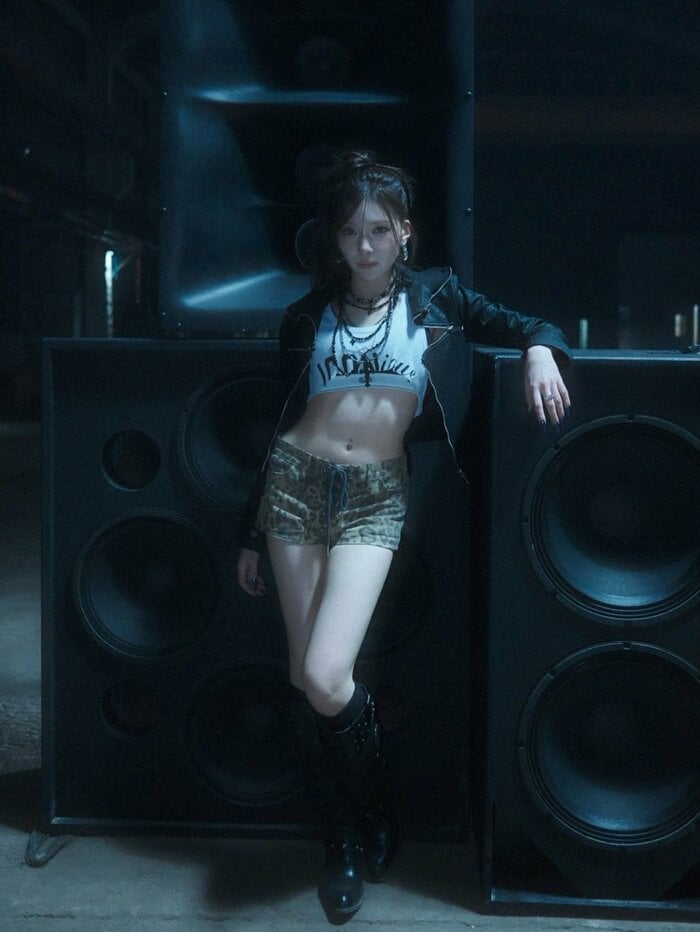 巨大なスピーカーの前ですらりとたたずんだショットも!キュッと引き締まったウエストやショーパンから伸びた長い足が際立ち、うっとり見とれてしまうほどのスタイルです。