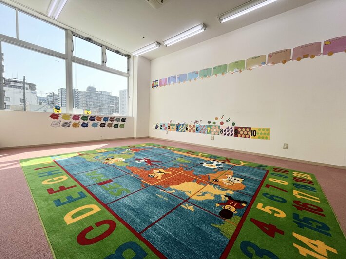 窓から日差しが入り開放感のある教室です。教室内には絨毯があるので0歳でも安心してお教室に入っていただけます。