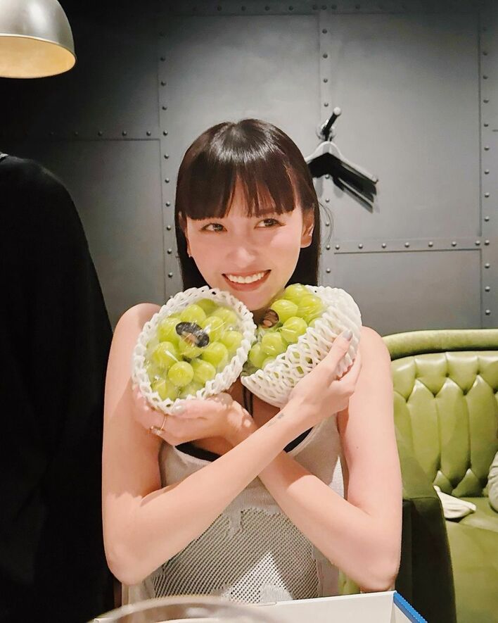 バースデープレートや両手にマスカットを持って笑顔を見せる鈴木さんのほか、