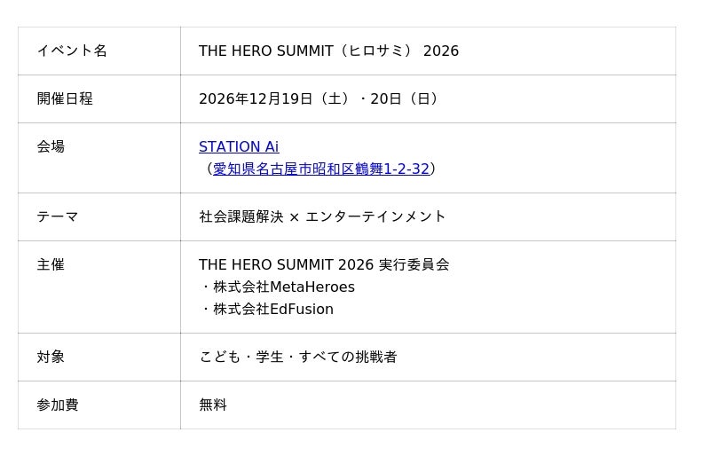 株式会社EdFusion(本社:愛知県、代表取締役:近藤にこる)は、2026年12月19日(土)・20日(日)の2日間、愛知県名古屋市の日本最大級のオープンイノベーション拠点「STATION Ai」にて、社会課題解決とエンターテインメントを融合した体験型イベント「THE HERO SUMMIT 2026(ヒロサミ)」 を開催することを発表いたします。