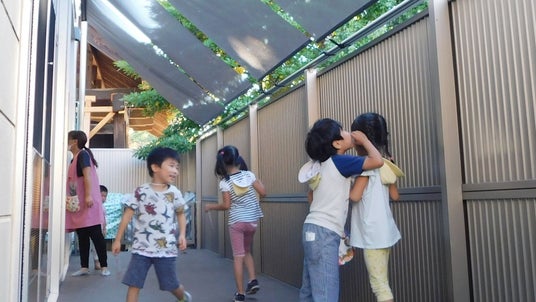 シェードを設置したデッキでは、子どもたちが快適に遊ぶ姿が。