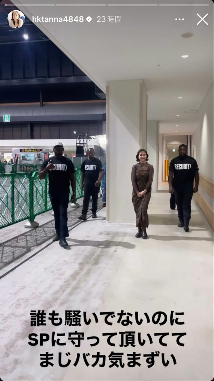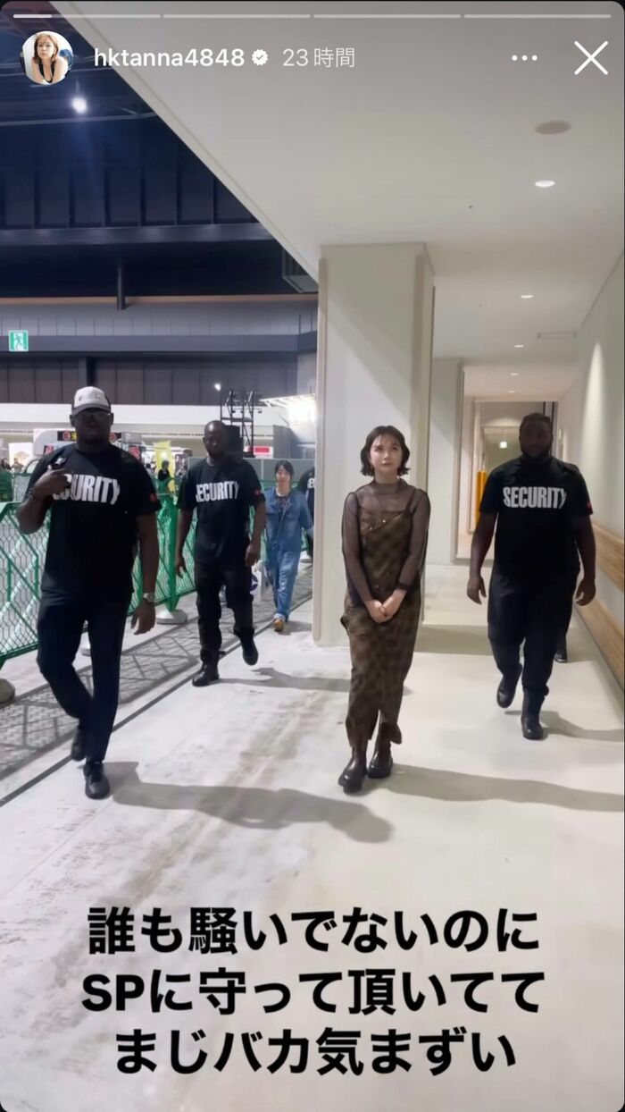 続けて投稿されたストーリーズでは「申し訳なさすぎてずっと斜め上見てた」というコメントとともにSPに守られながら歩いているときの自身の様子を振り返っています。