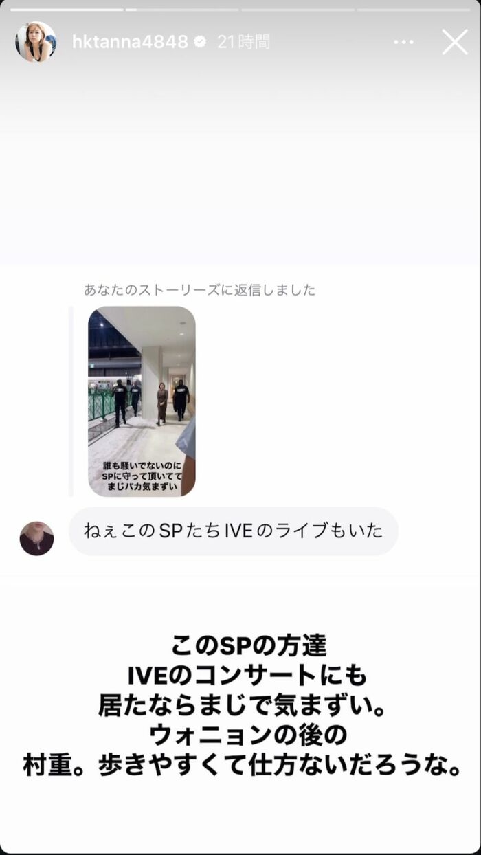 その数時間後、この投稿にファンから「ねぇこのSPたちIVEのライブにもいた」とまさかのコメントが寄せられ、大人気のK-POPガールズグループ・IVEを守っていたSPであることを知った村重さんは「このSPの方達IVEのコンサートにも居たならまじで気まずい。ウォニョンの後の村重。歩きやすくて仕方ないだろうな。」と自虐コメントで笑いを誘いました。