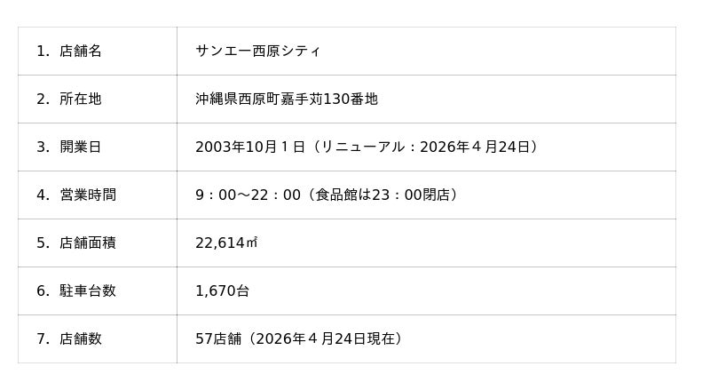 株式会社サンエー(本社:沖縄県宜野湾市、代表取締役社長: 豊田沢)は、2026年4月24日、沖縄県西原町の「サンエー西原シティ」をリニューアルオープンいたします。