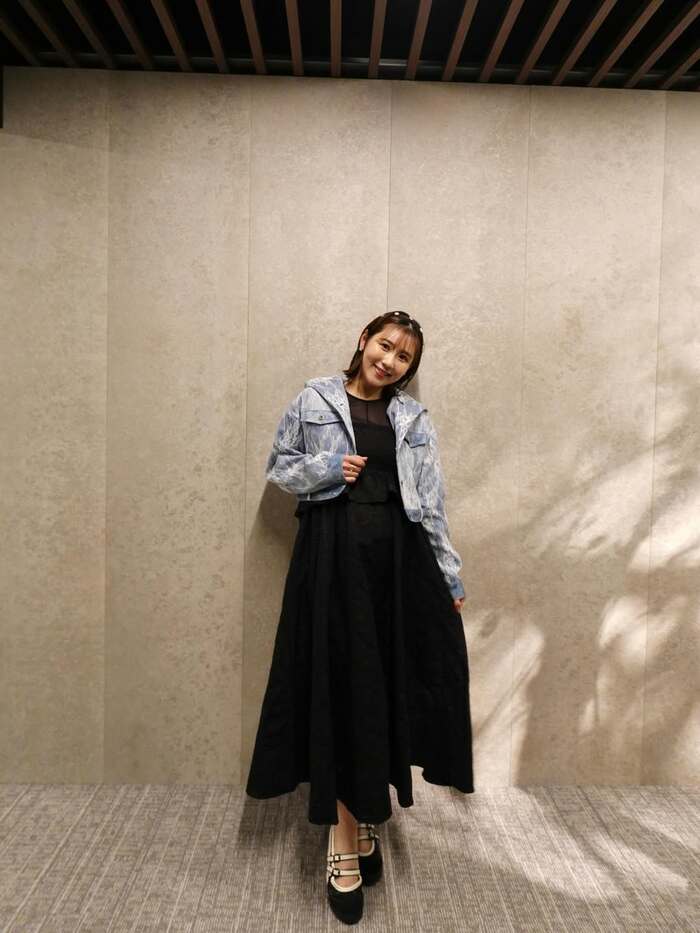 写真を見てみると、黒のふんわりワンピースにショート丈のデニムジャケットを羽織り、白と黒のバイカラーのパンプスを合わせた“大人かわいい”コーデに仕上がっています。また、シルバーの花がついたカチューシャもアクセントに。