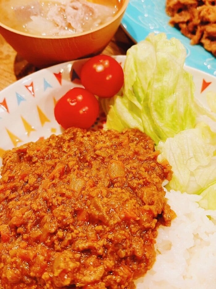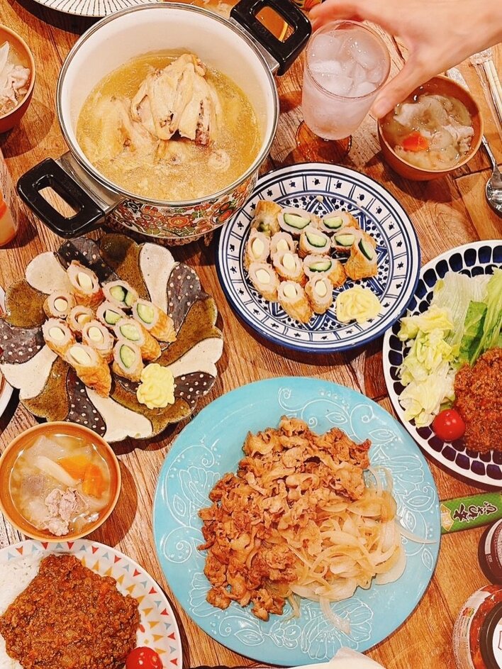 知人を家に招いたときのものと見られる食卓では、「普段の家ご飯のまま 気取らず飾らずキーマカレーと参鶏湯が一緒に並ぶよ」と普段家庭でも作っているというメニューを披露。