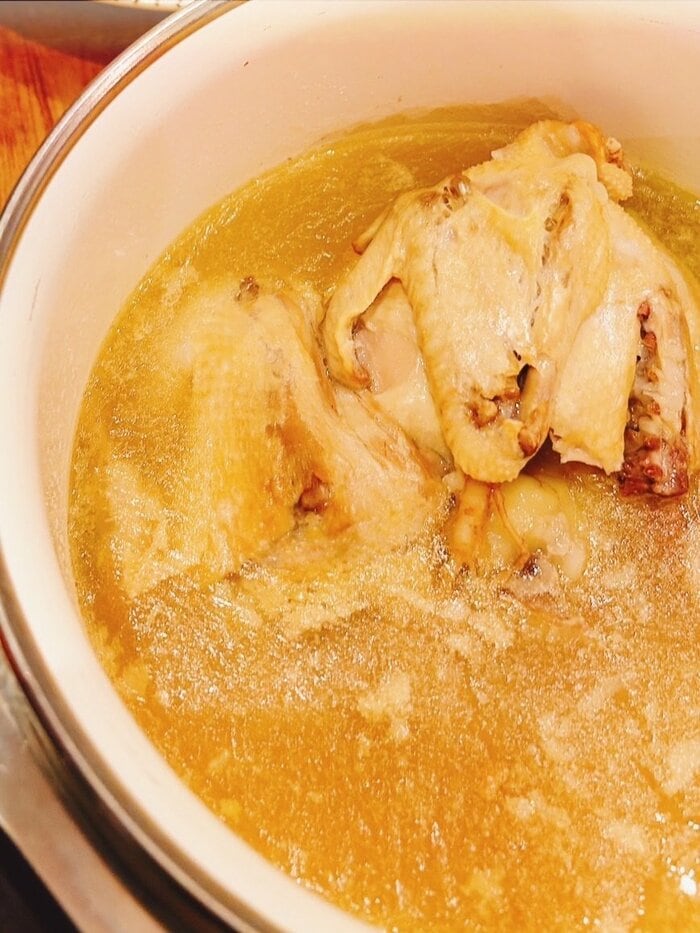 鍋の中にドンと入った鶏肉がしっかりと煮込まれていて、ホロホロとお肉がほどけそうなサムゲタンや…