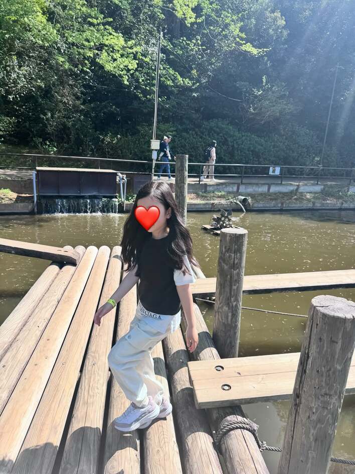 自然豊かな公園で、半袖トップスにパンツスタイルでスニーカーを合わせ、ロングヘアをなびかせる長女の姿からは、全力で水上アスレチックを楽しんでいる様子が伝わってきます。
