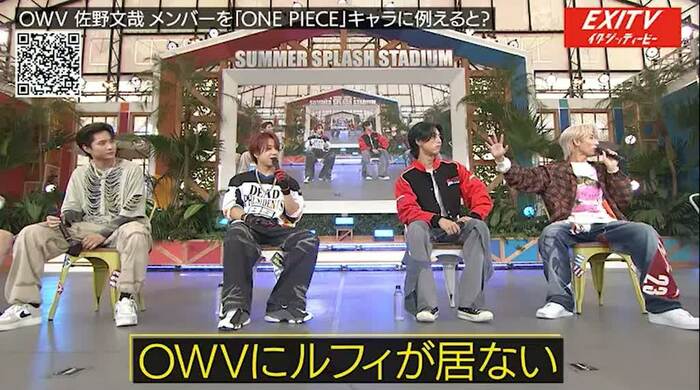 りんたろー。さんから、「OWVメンバーを『ONE PIECE』キャラに例えると?」と質問をされた佐野さんは、浦野さんは大口を叩くという理由で「ウソップ」、中川さんは家で“パンイチ”でクワガタの孵化を見ていたことがあるため、露出を好む変態の「フランキー」、そしてリーダーの本田さんは愛らしさもある頑張り屋ということで「チョッパー」に例えました。