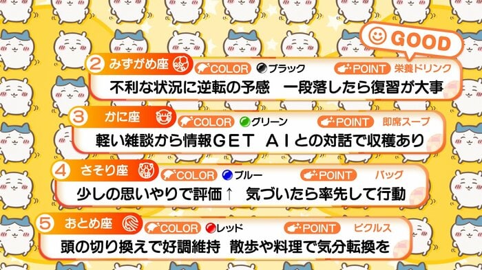『めざましテレビ』で放送中の「ちいかわ占い」 テレビ放送がない日はお休みで、月~土:朝7時以降に更新予定です。