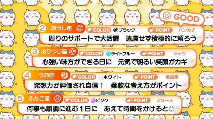 『めざましテレビ』で放送中の「ちいかわ占い」 テレビ放送がない日はお休みで、月~土:朝7時以降に更新予定です。