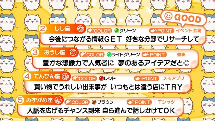 『めざましテレビ』で放送中の「ちいかわ占い」 テレビ放送がない日はお休みで、月~土:朝7時以降に更新予定です。