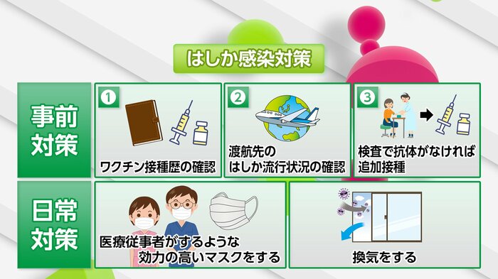 母子手帳で、接種履歴を確認しておく、渡航先のはしかの流行状況を把握しておく、血液検査で自分の抗体価を調べておくのもいいですね。