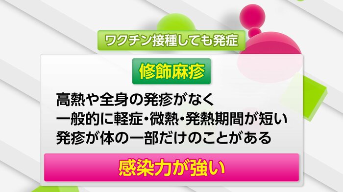 ワクチン接種しても発症する「修飾麻疹」とは、高熱や全身の発疹がなく、一般的に軽症・微熱・発熱期間が短い発疹が体の一部だけのことがある症状のことで、感染力は強いとされています。