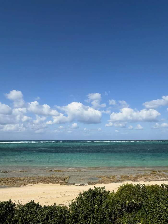 写真には、透き通ったエメラルドグリーンの海が広がる開放的なビーチが収められています。