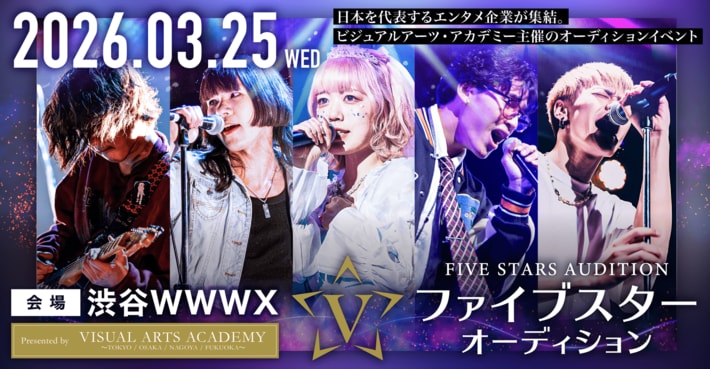 学校法人 21世紀アカデメイア(学長:田坂広志、本部:東京都千代田区)が設置するエンターテインメントのイノベーション・カレッジ「ビジュアルアーツ・アカデミー」(所在地:東京都千代田区、ほか全国4校)は、2026年3月25日(水)、東京・渋谷のライブハウス「WWW X」にて、全国の姉妹校から選抜された学生による大型オーディションイベント『FIVE STARS AUDITION 2026』を開催しました。
