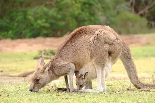 生まれてすぐに、お母さんカンガルーが自分のお腹の毛を舐めて作った道をよじ登り、育児嚢というお腹の袋の中に入ります。生後半年ほど経つと袋から顔を出すので、多くの動物園では顔を出した日をカンガルーの誕生日としています。