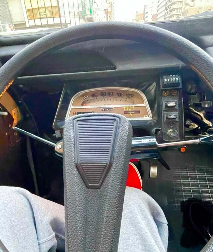 ハンドルの奥に見える黒いダッシュボード中央には、色褪せた速度計が配されており、レトロな魅力を放っています。窓の外には都市部のビル群が広がり、クラシックな車内と現代的な風景との対比が印象的です。