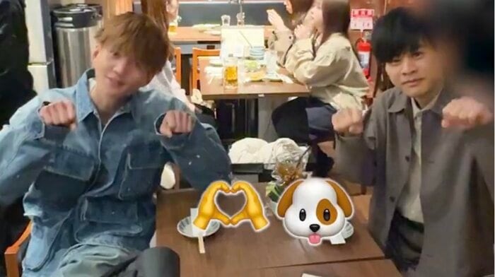 居酒屋さんのシーンの撮影合間、SNS用のカメラを見つけると、ジョッキを片手にふっと微笑んだり、本田の旧友・広野智樹役の東龍之介さんと一緒に“ラブドワンポーズ”をしたり。