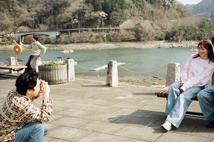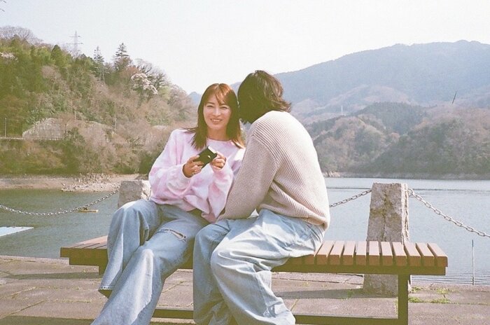 背景には、水辺と山々が広がる美しいロケーション。フィルム写真特有の淡い色合いとも相まって、どこか懐かしさを感じさせるような仕上がりです。
