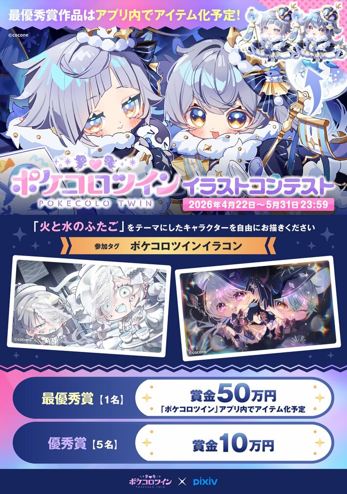 ココネ株式会社(本社:東京都世田谷区、代表取締役社長:石渡 真維、以下「ココネ」)は、ふたごのアバター「ココロン」の着せかえやお客さま同士のコミュニケーションが楽しめるスマートフォン向けアプリ『ポケコロツイン』において、ピクシブ株式会社が運営するイラストコミュニケーションサービス「pixiv」とのコラボレーション企画として、「pixiv × ポケコロツイン イラストコンテスト」を2026年4月22日(水)より開催することをお知らせします。