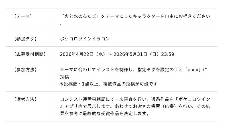 本コンテストでは、テーマ「火と水のふたご」で募集した作品の中から選ばれた最優秀賞(1名)作品を、『ポケコロツイン』アプリ内のアイテムとして制作・実装予定です。あなたの描いた“ふたご”が、実際にアプリ内で多くのお客さまに着せかえとして楽しまれる特別企画となります。