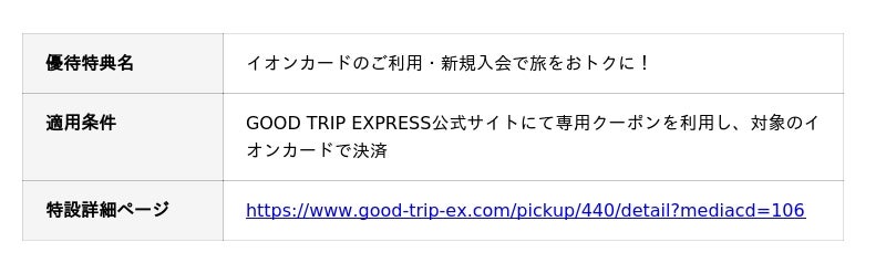 大型連休や夏休みに向け、国内旅行への関心が一段と高まっております。GOOD TRIP EXPRESSでは、より多くのお客様に「気軽で充実した旅」をお楽しみいただきたいという思いから、日常のお買い物で親しまれている「イオンカード」とタッグを組み、旅行代金の実質負担を軽減する本特典をご案内いたします。イオンカードをお持ちの方への優待特典!