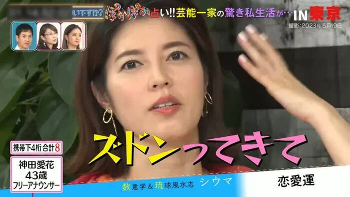 シウマさんは、神田さんについて「ホテルマンや警察官など、制服が好き」と鑑定すると、神田さんは「最初の彼氏はパイロットでした」と驚きの顔に。