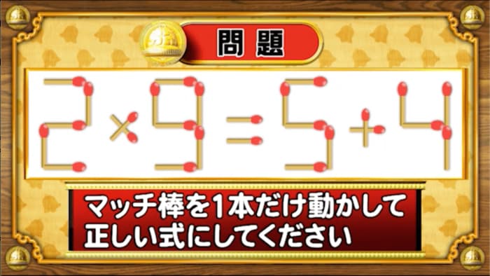 「2×9=5+4」。この式のマッチ棒を1本だけ動かして正しい式にしてください。