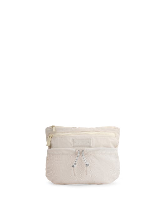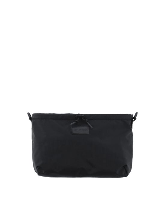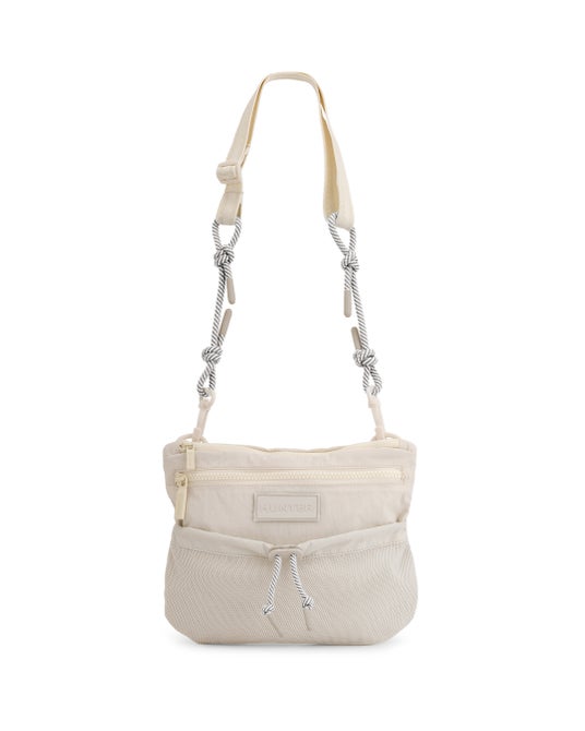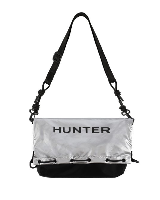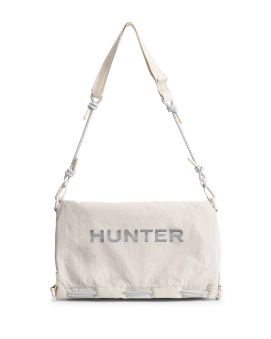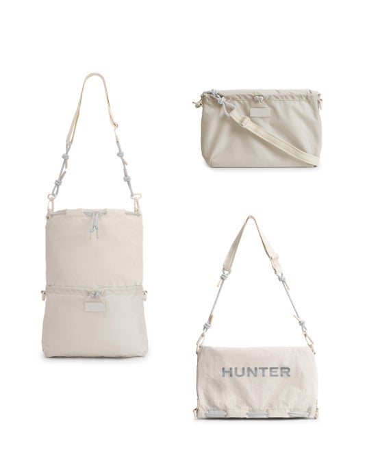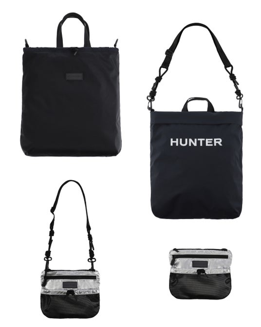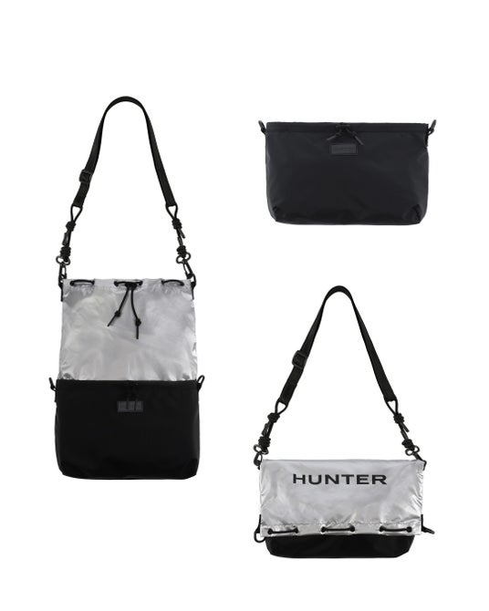 トラベルマルチファンクションサコッシュは、シーンに合わせて2パターンのサコッシュとトートバッグとして使用できます。本体を半分に折りたたみ、折り目横の留め具にストラップを付ければサコッシュへと変身します。気分に合わせて、1.PVCロゴを表に出すスタイル、2.プリントHUNTERロゴを表に出す2パターンのスタイルが楽しめます。メインコンパートメントには小物収納に便利な内ポケット付き。3.本体を折らずに開口部横の留め具にストラップをつければトートバッグへと変身します。A4サイズも収納可能で出先で荷物が増えたときにも使い勝手が良く重宝するアイテムです。