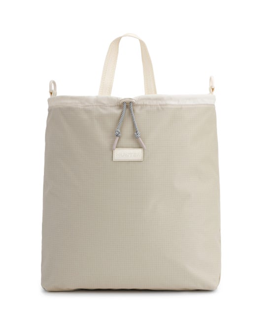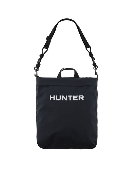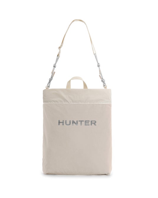 トラベルマルチファンクショントートは、シーンに合わせてトートバッグ(2スタイル)とミニクロスボディバックの3WAYでの使用が可能です。トートバッグはリバーシブル仕様でA4サイズやPCも十分に収納可能なサイズ感となっており、1.PVCロゴを表にしたスタイル、2.大きめのプリントHUNTERロゴを表にした2パターンのスタイルが楽しめます。3.収納袋にバックパックのショルダーストラップを取り付けるとミニクロスボディバックとしても使用できます。4.付属の収納袋は取り外し可能となっており、小物などを収納する単体のミニポーチとしても使用可能です。