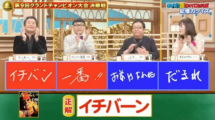 正解は、「イチバーン」。フッキーさんとイジリーさんが見事正解!