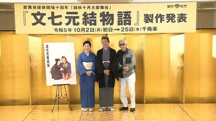 9月11日、来月から東京・銀座の歌舞伎座で上演される「文七元結物語」の製作発表記者会見が行われ、主演の中村獅童さん、寺島しのぶさん、今回初めて歌舞伎座の演出を務める、映画監督の山田洋次さんが登場しました。