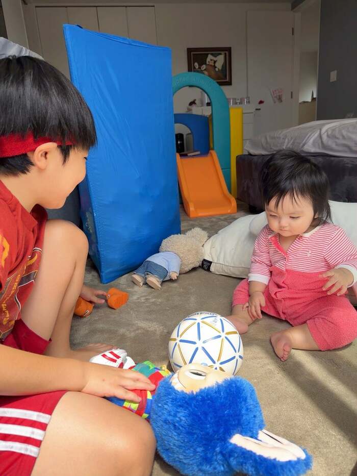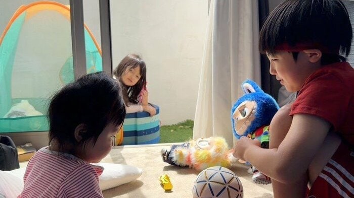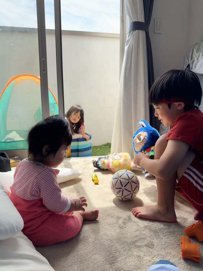 今回の投稿では「お兄ちゃんとグーちゃんがサッカー♡♡♡」とつづり、子どもたちが遊ぶ様子を公開。