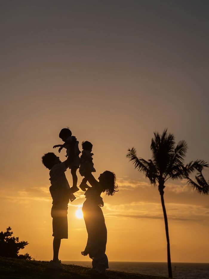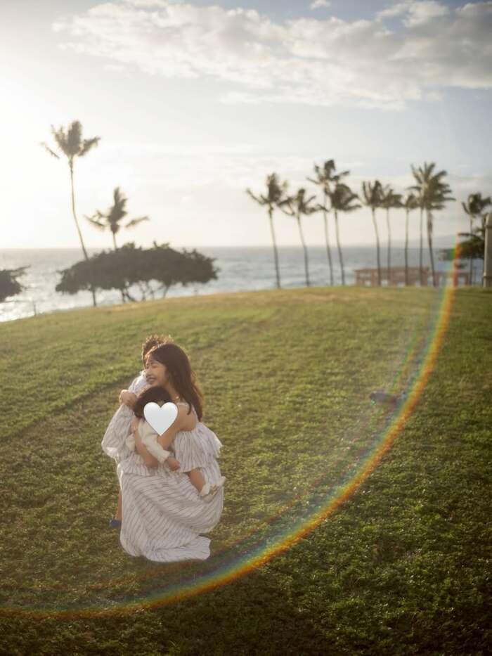 さらに、夕暮れ時のやわらかな光の中で、夫と向かい合い、子どもたちを空高くへと持ち上げた姿のシルエットが浮かび上がった1枚では、舟山さんのふっくら大きくなったおなかが夕日に照らされていて、赤ちゃんがすくすく元気に育っていることがうかがえます。