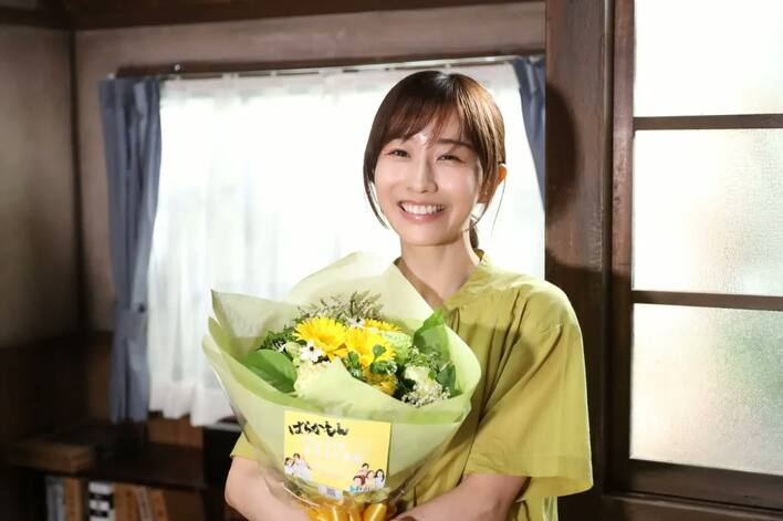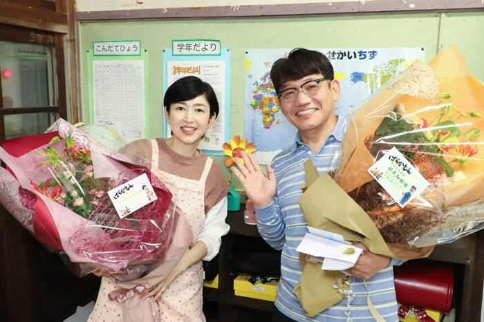 また、夫婦役を演じた山口さんと飯尾さんは、同じシーンで撮影終了を迎え、花束を抱えて仲良く記念撮影に応じました。