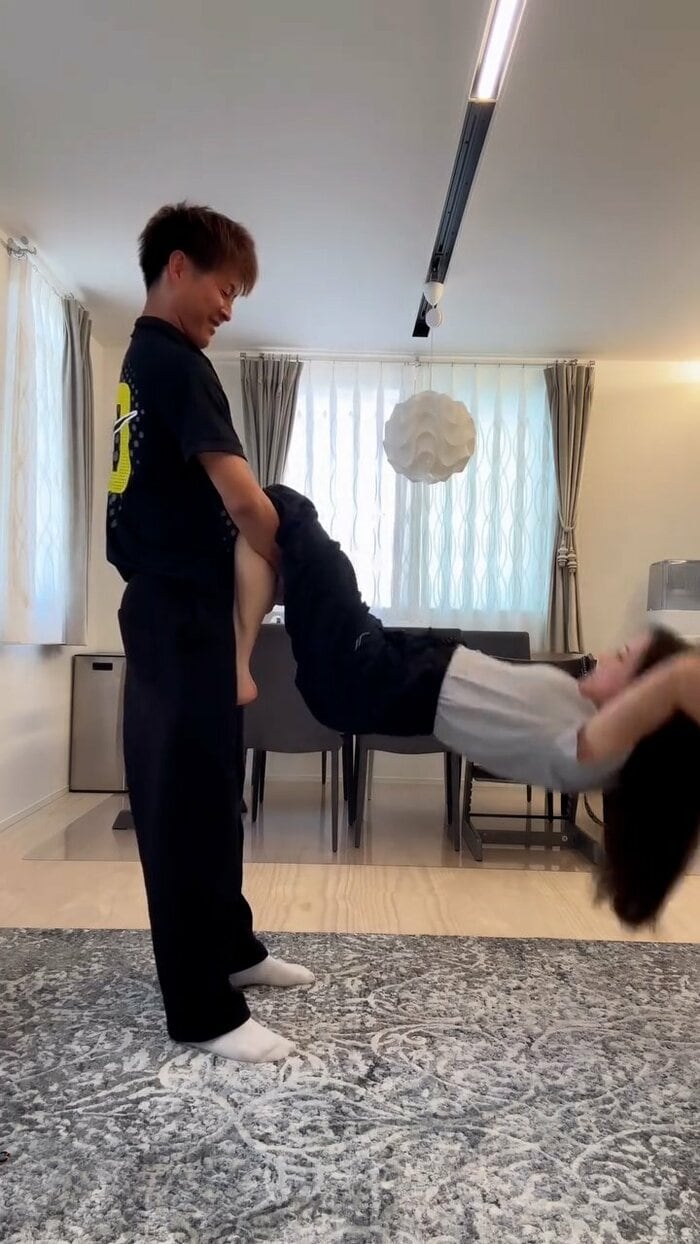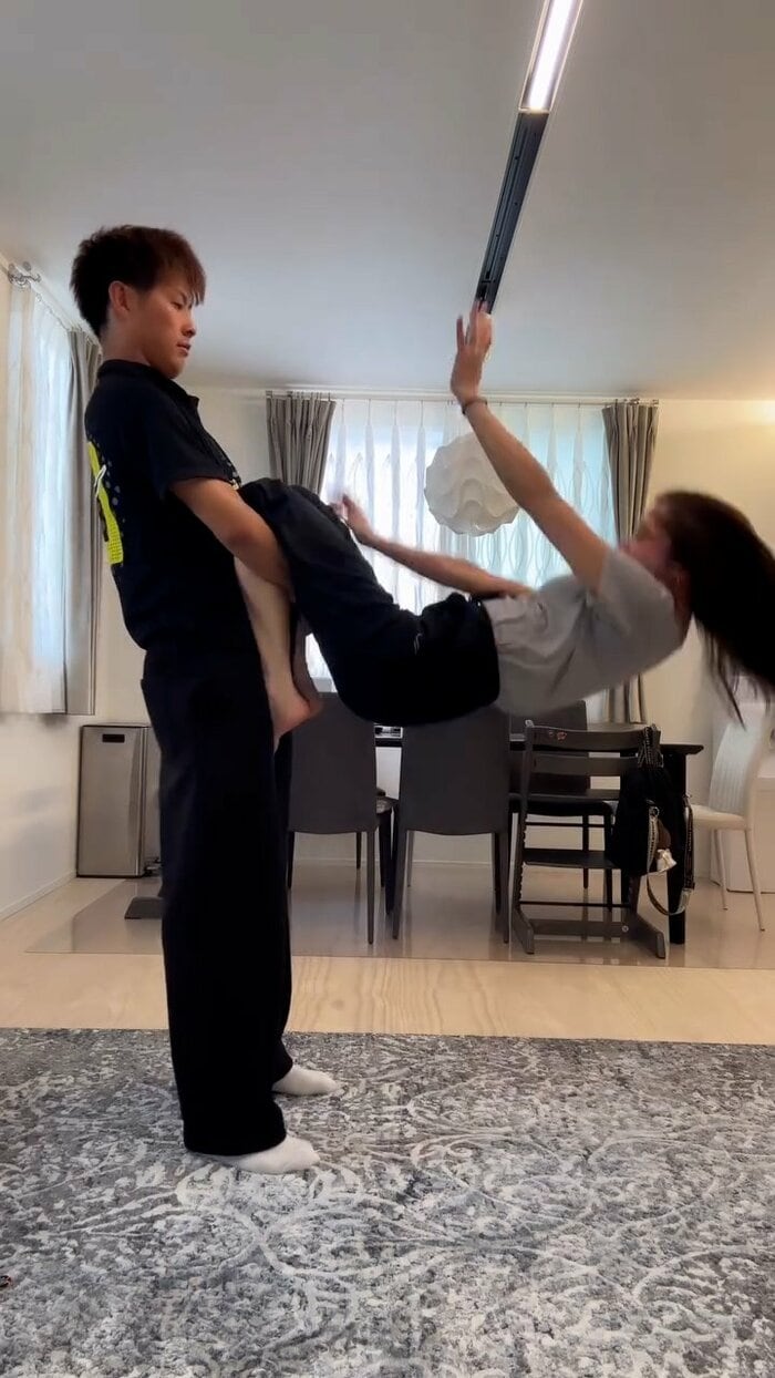 今回の投稿では、自宅の広々としたリビングダイニングで、黒いTシャツにパンツ姿の柿谷さんと、グレーのトップスに黒のワイドパンツを合わせた丸高さんが、息の合ったアクロバティックなトレーニングを披露しました。