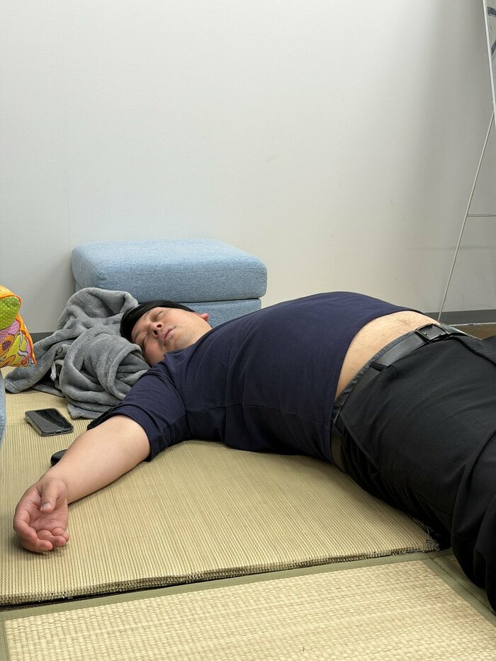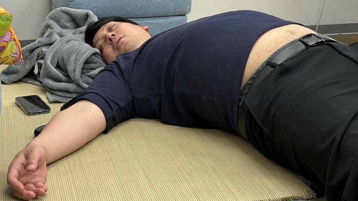 写真を見てみると、まるでアニメから出てきたようなふっくらおなかが目に飛び込んできます!あまりの大きさでシャツの裾が上がり、おへそも披露。広げていた腕は力が抜けており、完全に爆睡している様子。自身の上着か膝掛けを枕にしているのでしょうか、写真から気持ちよさそうな寝息が聞こえてきそうです。