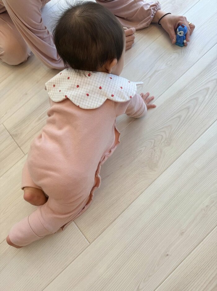 白木目の床の上を、小さな手足を懸命に動かして前へと這って進む夢空ちゃん。