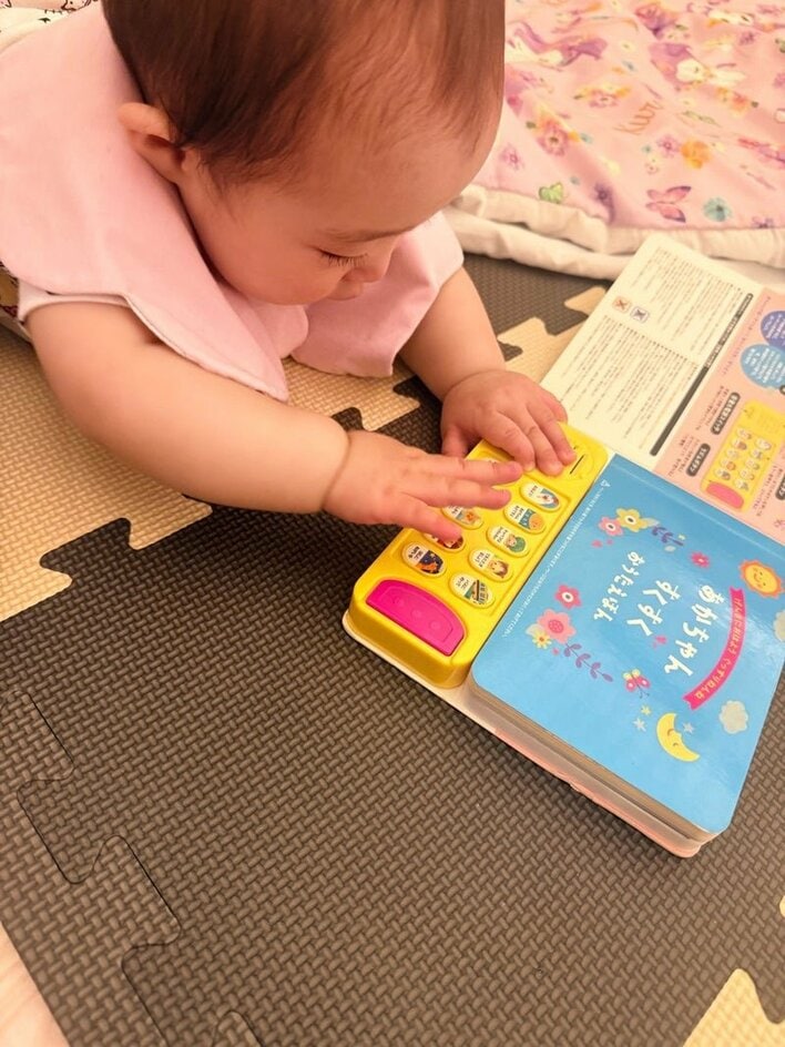 写真には、クッションマットの上でうつ伏せの姿勢で遊ぶ夢空ちゃんの姿が。目の前にある絵本型のおもちゃにすっかり夢中になっているようです。