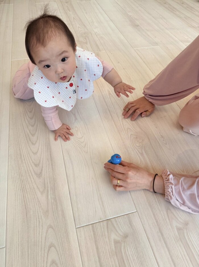 視線の先には青いおもちゃの人形があり、まるで宝物を見つけたかのように、それを目標にして進んでいます。昨日より今日、今日より明日へと成長していく喜びがひしひしと感じられますね。