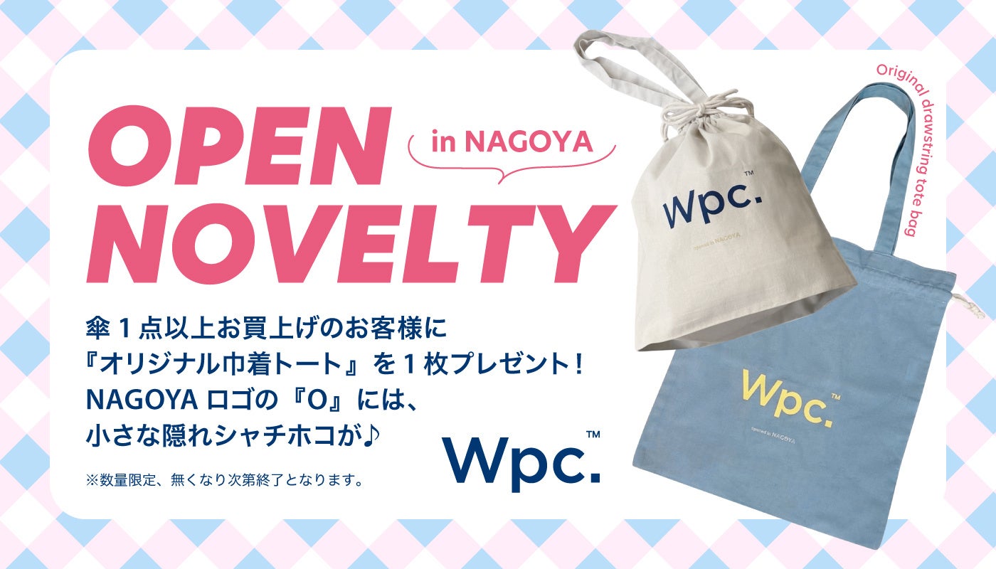 Wpc. タカシマヤ ゲートタワーモール店のオープンを記念し、傘を1点以上、お買上げのお客様に『オリジナル巾着トート』を1枚プレゼントいたします。