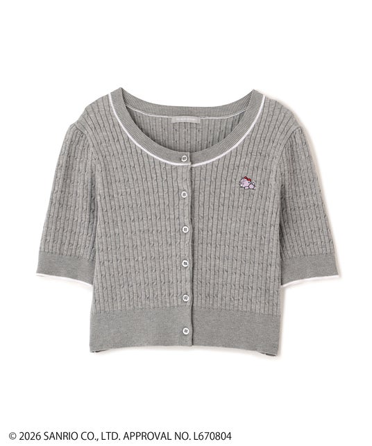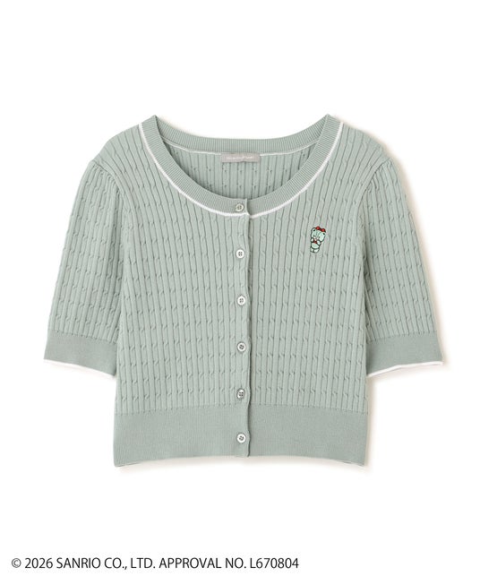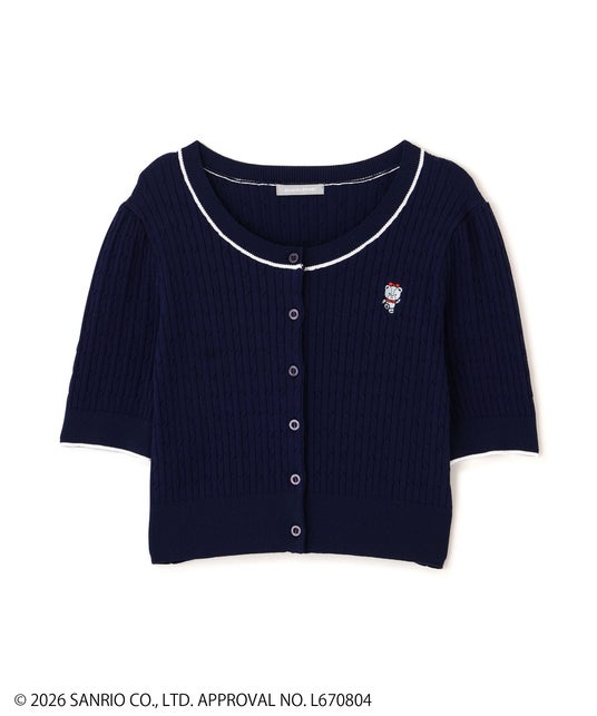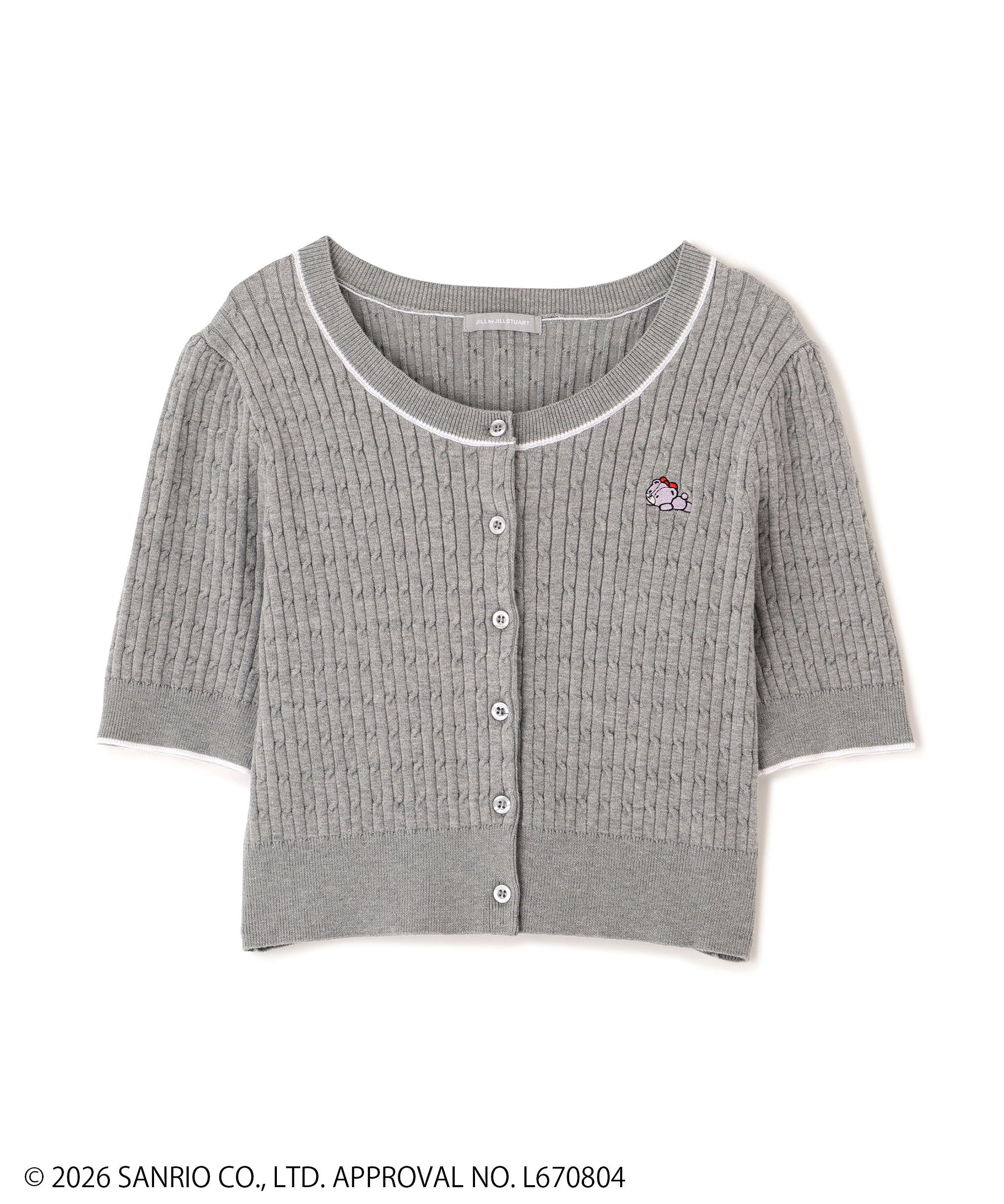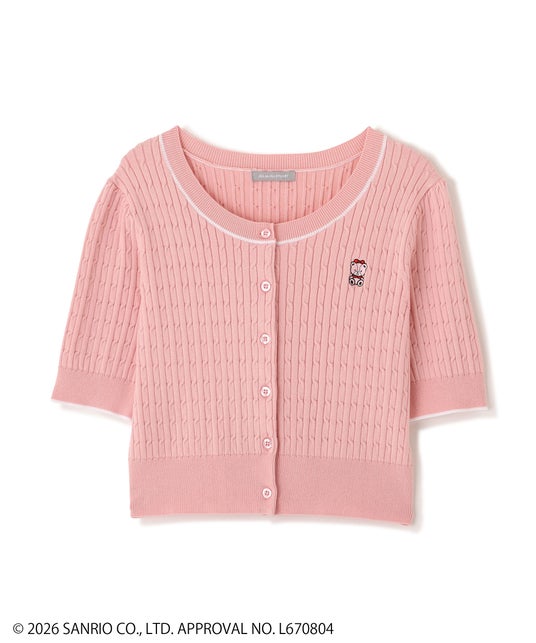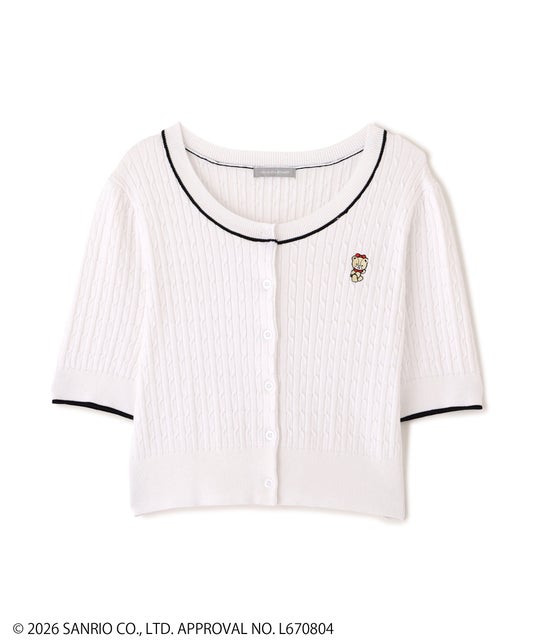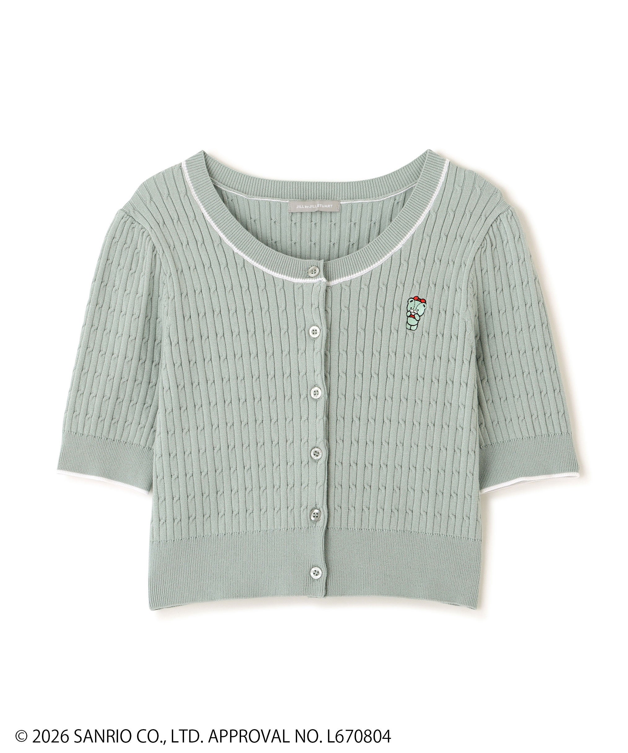 「タイニーチャム」コラボの半袖ニットカーデ。タイニーチャムをイメージしたカラーに合わせて、6色展開。ニットのカラー展開はコーディネートしやすい配色にし、日常的に「タイニーチャム」を着こなせるようにデザインに落とし込みました。襟ぐりと袖口の配色ラインがポイント。