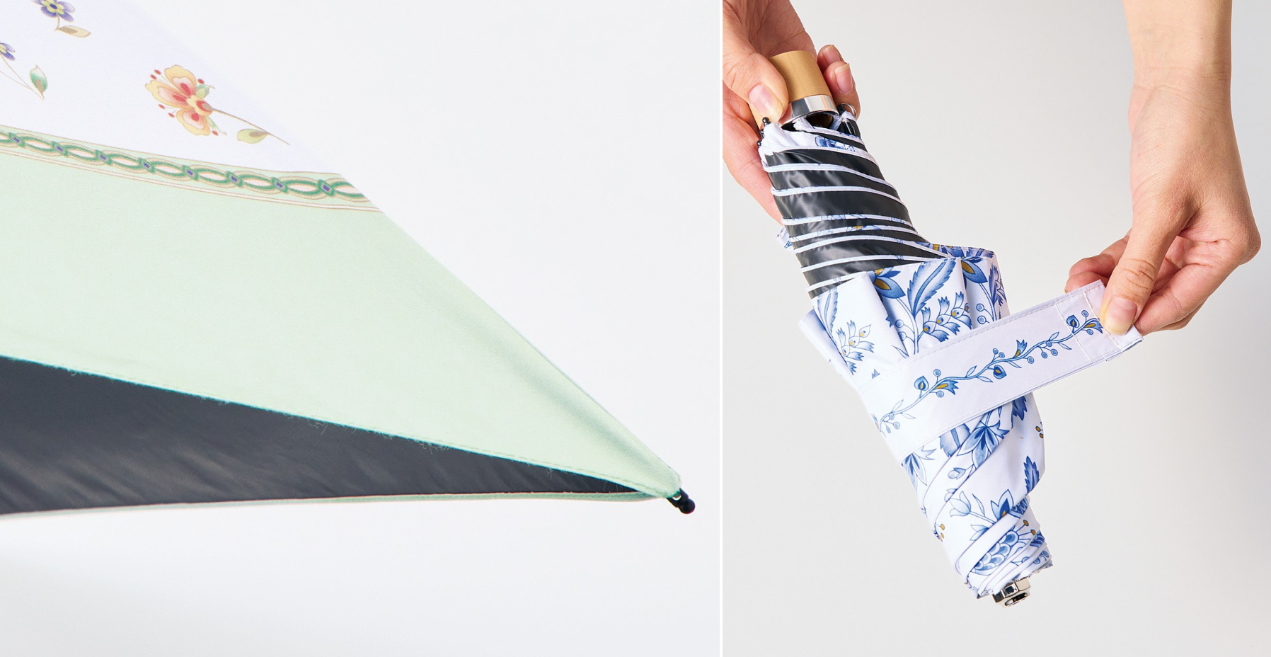 UVカット率99%以上、遮光率99.99%で、晴れた日も安心です。裏側はブラックになっていて紫外線をしっかりカットしてくれます。たたむときは太めのベルトで留めやすいのもポイント。同柄の傘袋に入れて持ち運べます。