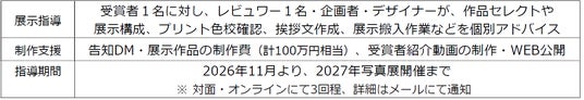 受賞者4名は展示準備方法などを直接学び、写真家と二人三脚で写真展を作り上げていきます。受賞者には、告知物・展示作品などの制作費もサポート。